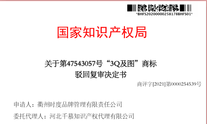 热烈祝贺第47543057号" 3Q及图”商标驳回复审案成功