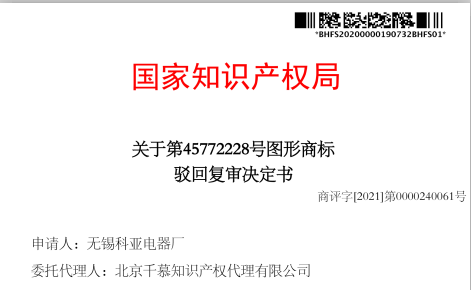 热烈祝贺第45772228号图形商标驳回复审案成功