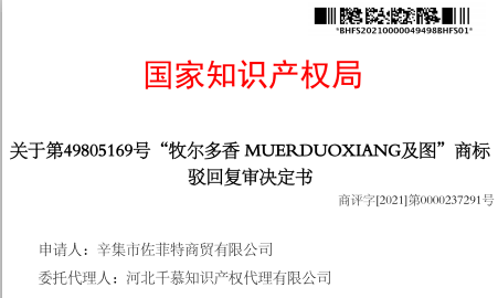 热烈祝贺第49805169号" 牧尔多香MUERDUOXIANG”商标驳回复审案成功