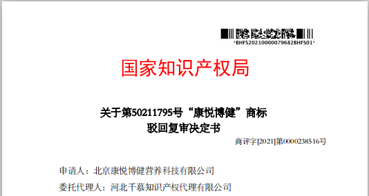 热烈祝贺第50211795号" 康悦博健”商标驳回复审案成功