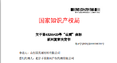 热烈祝贺第43255423号" 云盾”商标驳回复审案成功