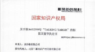 热烈祝贺第36652318号" TALKING TABLES”商标驳回复审案成功