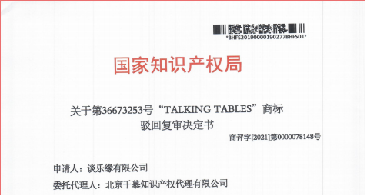 热烈祝贺第35673253号" TALKING TABLES”商标驳回复审案成功