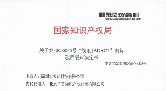 热烈祝贺第42033355号"战讯JADAOL ”商标驳回复审案成功