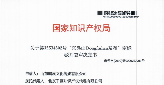 热烈祝贺第35534502号" 东凫山 DONG FU SHAN及图”商标驳回复审案成功