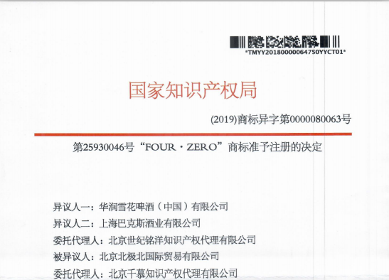 热烈祝贺第25930046号" FOUR.ZERO”商标驳回复审案成功