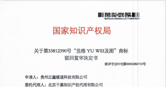 热烈祝贺第33812390号" 昱维YU WEI 及图”商标驳回复审案成功
