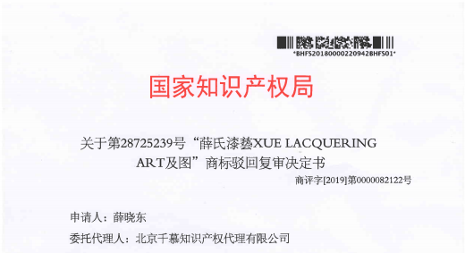 热烈祝贺第28725239号" 薛氏漆艺XUE LACQUERING ART及图”商标驳回复审案成功