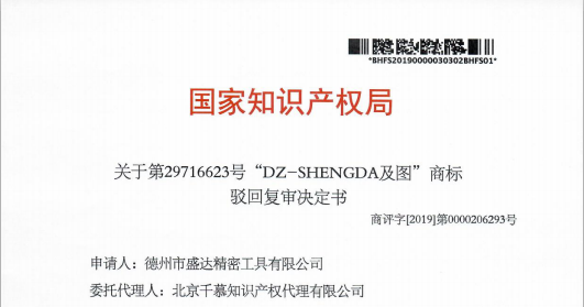 热烈祝贺第29716623号"DZ-SHENGDA及图 ”商标驳回复审案成功
