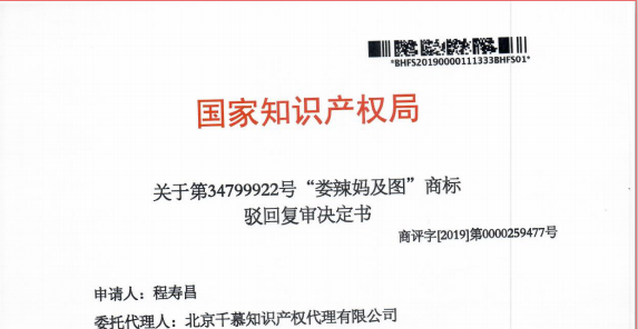 热烈祝贺第34799922号" 娄辣妈及图”商标驳回复审案成功