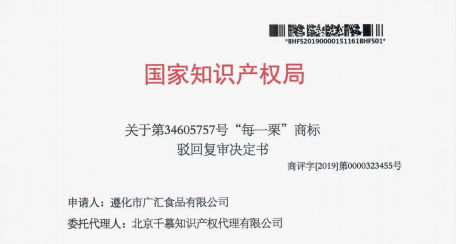 热烈庆祝第34605757号“每一粟”商标驳回复审成功