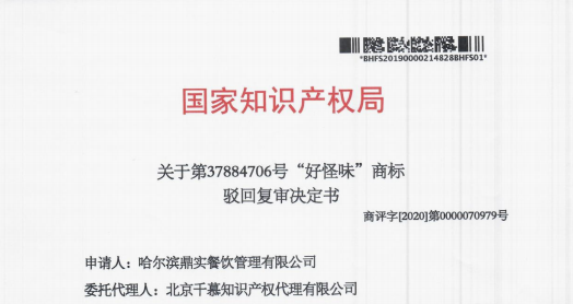 热烈庆祝第37884706号“好怪味”商标案驳回复审成功