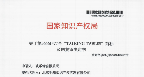 热烈庆祝第36661477号“TALKING TABLES”商标驳回复审成功