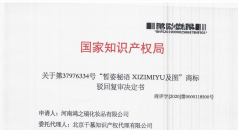 热烈庆祝第37976334号“皙姿秘语XIZIMIYU及图”商标驳回复审成功