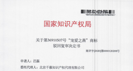 热烈庆祝第36910507号“宠爱之燕”商标驳回复审成功