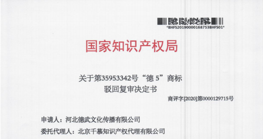 热烈庆祝第35953342号“德5”商标驳回复审成功