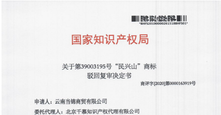 热烈庆祝第39003195号“民兴山”商标驳回复审成功