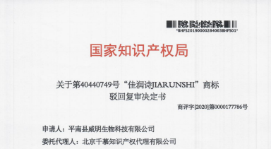 热烈庆祝第40440749号“佳润诗JIARUNSHI”商标驳回复审成功