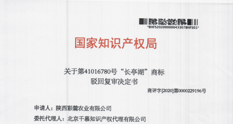 热烈庆祝第41016780号“长亭湖”商标驳回复审成功