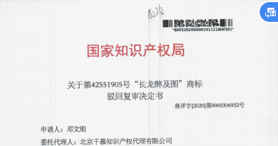 热烈庆祝第42551905号“长龙醉及图”商标驳回复审成功