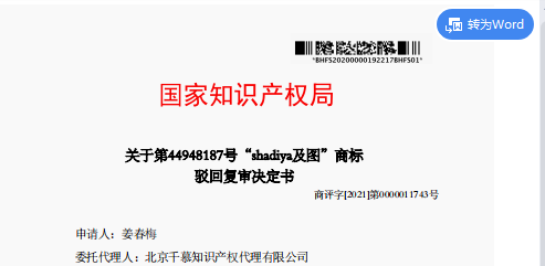 热烈庆祝第44948187号“SHADIYA及图”商标驳回复审成功